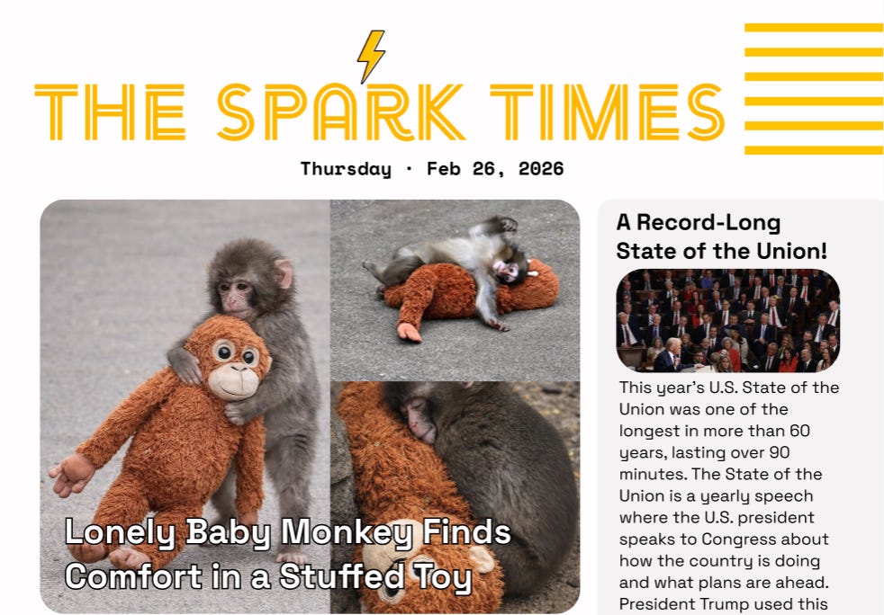 Feb 26, 2026: Lonely Baby Monkey Finds Comfort in a Stuffed ToyHow Long Did Dinosaurs Live for? (for Mini!)Feb 25, 2026∙ Paid4ShareDelivered: today’s The Spark Times.Click download button below to print and share!Continue reading this post for free, courtesy of The Spark Times Inc..Claim my free postOr purchase a paid subscription.