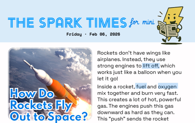 Spark Times Mini | How Do Rockets Fly Out to Space?Starting next week, our ‘mini’ news will be combined with the Spark Times!Feb 05, 20265SharePlease note that starting next week, our ‘mini’ news will be combined with the Spark Times.Delivered: today’s The Spark Times for Mini!Click download button below to print and share!The Spark Times Mini Feb 62.02MB ∙ PDF fileDownloadDownload