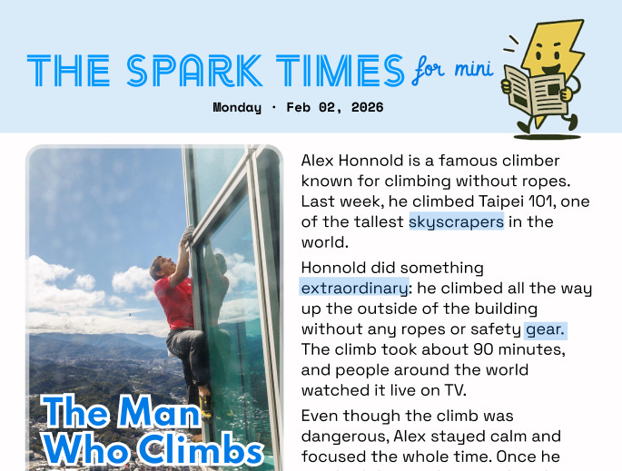 Spark Times Mini | Meet the Man Who Climbs SkyscrapersFeb 01, 20265ShareDelivered: today’s The Spark Times for Mini!Click download button below to print and share!The Spark Times Mini Feb 2, 20263.18MB ∙ PDF fileDownloadDownload