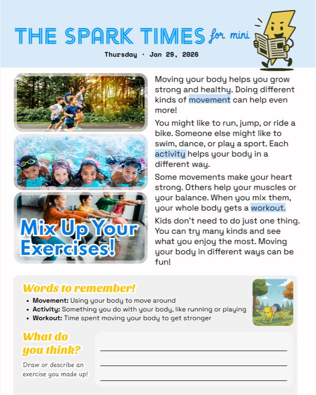 Spark Times Mini | Mix Up Your Exercises!Jan 28, 20264ShareDelivered: today’s The Spark Times for Mini!Click download button below to print and share!The Spark Times Mini Jan 292.17MB ∙ PDF fileDownloadDownload