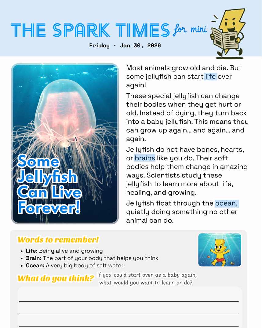 Spark Times Mini | Some Jellyfish Can Live Forever!Jan 29, 20266ShareDelivered: today’s The Spark Times for Mini!Click download button below to print and share!The Spark Times Mini Jan 301.7MB ∙ PDF fileDownloadDownload