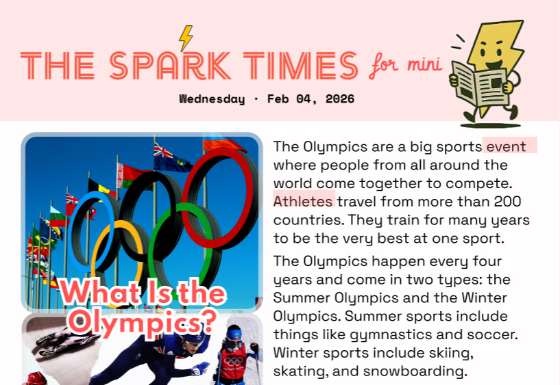 Spark Times Mini | What Is the Olympics?Feb 03, 20263ShareDelivered: today’s The Spark Times for Mini!Click download button below to print and share!The Spark Times Mini Feb 4, 20262.82MB ∙ PDF fileDownloadDownload