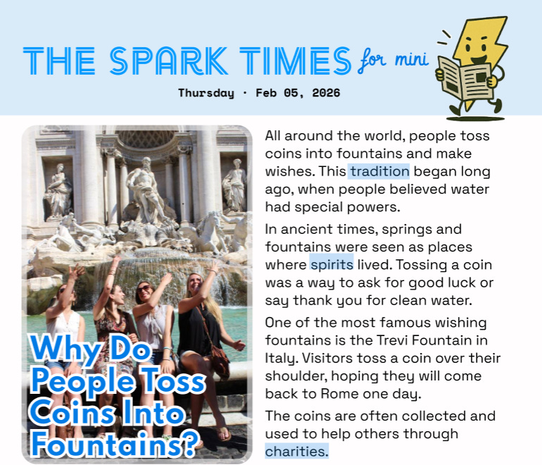 Spark Times Mini | Why Do People Toss Coins Into Fountains?Starting next week, our ‘mini’ news will be combined with the Spark Times!Feb 04, 20266SharePlease note that starting next week, our ‘mini’ news will be combined with the Spark Times.Delivered: today’s The Spark Times for Mini!Click download button below to print and share!The Spark Times Mini Feb 5, 20261.85MB ∙ PDF fileDownloadDownload